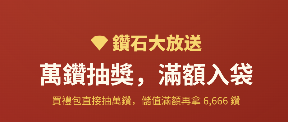 2/17 – 2/19 期間購買商城任意禮包,就抽 10,000 鑽石💎,成為 VIP 再加碼抽 50,000 鑽石💎,滿額 66,666 鑽石💎 再送 6,666 鑽石💎 ,新年這波大放送超划算,年終紅包通通可以砸進去了💰!