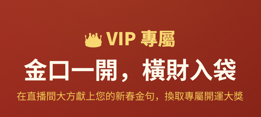 2/17 – 2/23 VIP限定活動,活動期間於任一間直播間,向辛苦的 SWAG 主播女神們獻上指定金句,就能換取限量開運大獎,保證是買不到的特殊好禮㊙️,這次升級 VIP 絕對不虧 🙌!