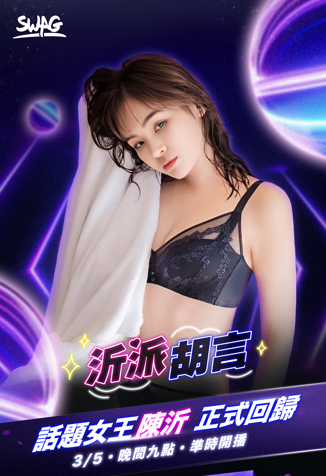 SWAG 女優/主播介紹 / SWAG 新聞 話題女王陳沂正式回歸 SWAG !「沂派胡言」直播火力全開 by SWAG5 3 月, 2026 ✨ 沂派胡言 ✨ SWAG 最敢聊的直播節目 《沂派胡言》將直球對決近期最火熱的新聞與網路事件,由陳沂火力全開即時開講、犀利評論!節目同步開放觀眾私訊投稿,不論是人生困惑、感情難題還是各種奇葩問題,全都來者不拒,話題無設限、尺度無上限🔥。首播更祭出超狂互動,開放粉絲即時競標陳沂「體毛」🥰,挑戰三上悠亞的競標紀錄!此外,節目也將撕開演藝圈不為人知的內幕,公開「藝人紅黑榜」,讓你觀眾看清螢幕前形象完美的指標人物,私下到底是天使👼還是惡魔😈。 👉 更多節目詳情